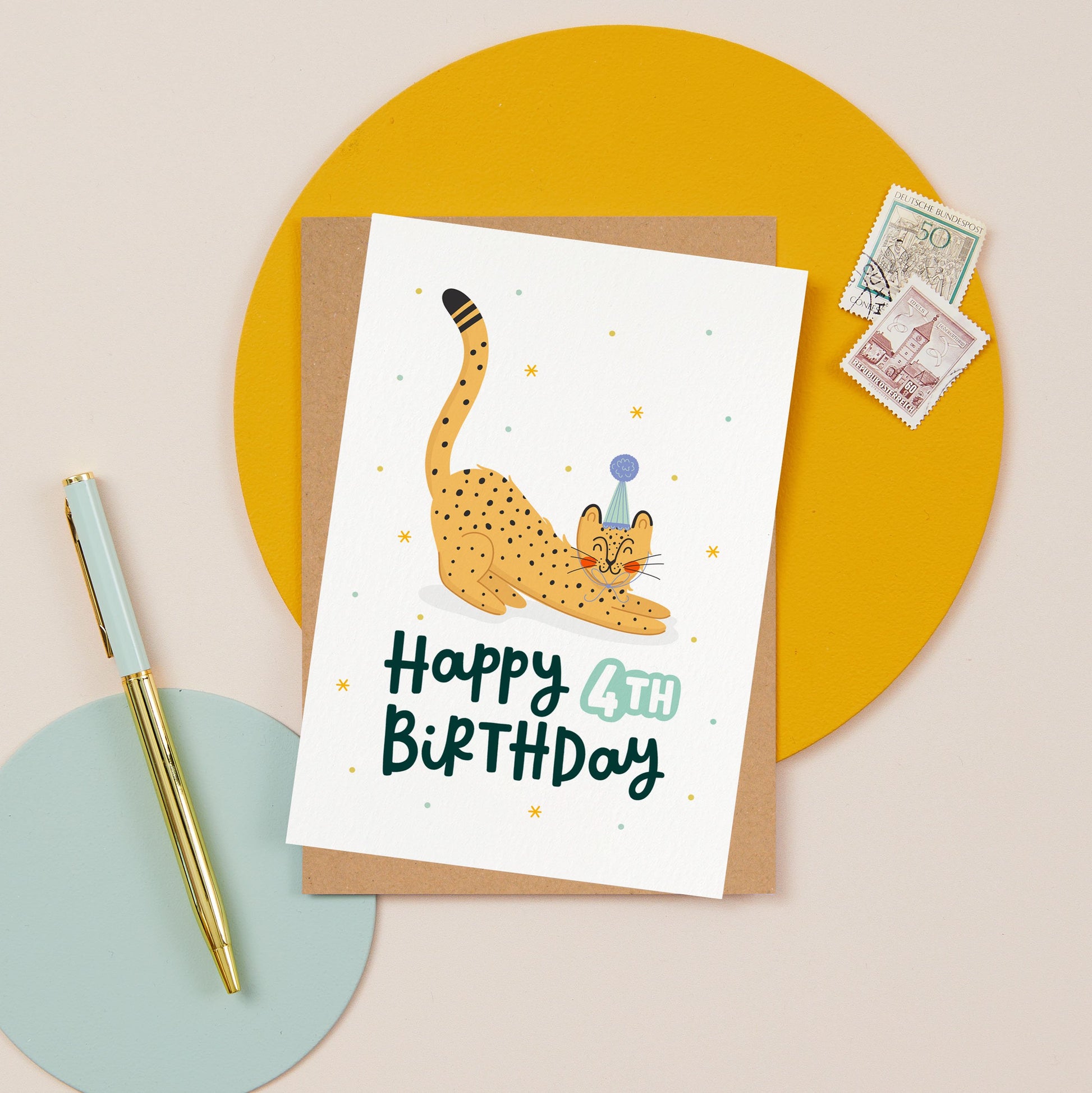 Celebrate your child’s fourth birthday with this charming birthday card! Featuring a cute cheetah illustration, it’s the perfect way to bring a smile to any jungle or safari animal fan on their special day.