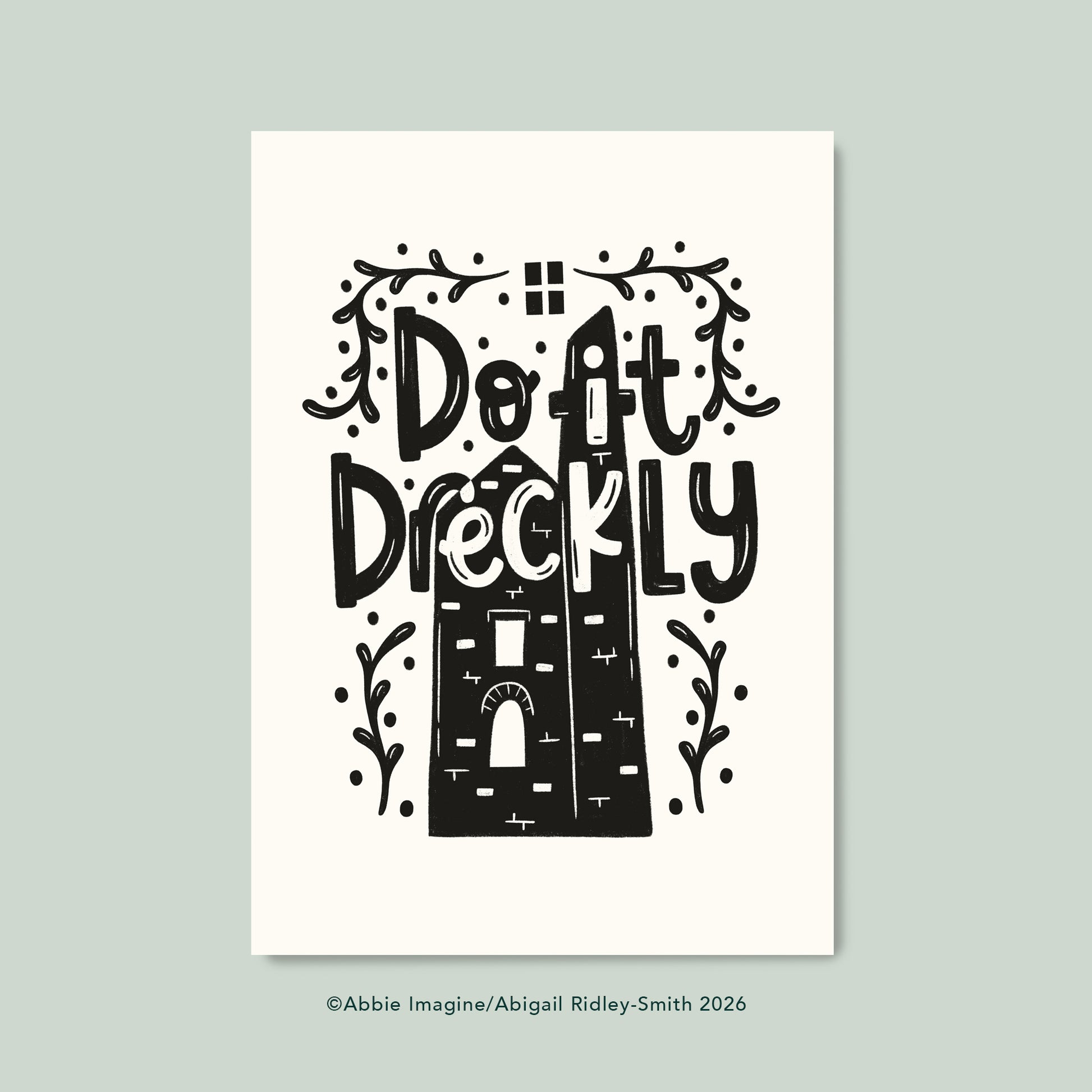 This Cornish words typography print says 'do it dreckly', a daily reminder not to rush. The hand lettering sits amongst an illustrated wheal and proudly celebrates Cornwall with the leafy decorations and Cornish flag!