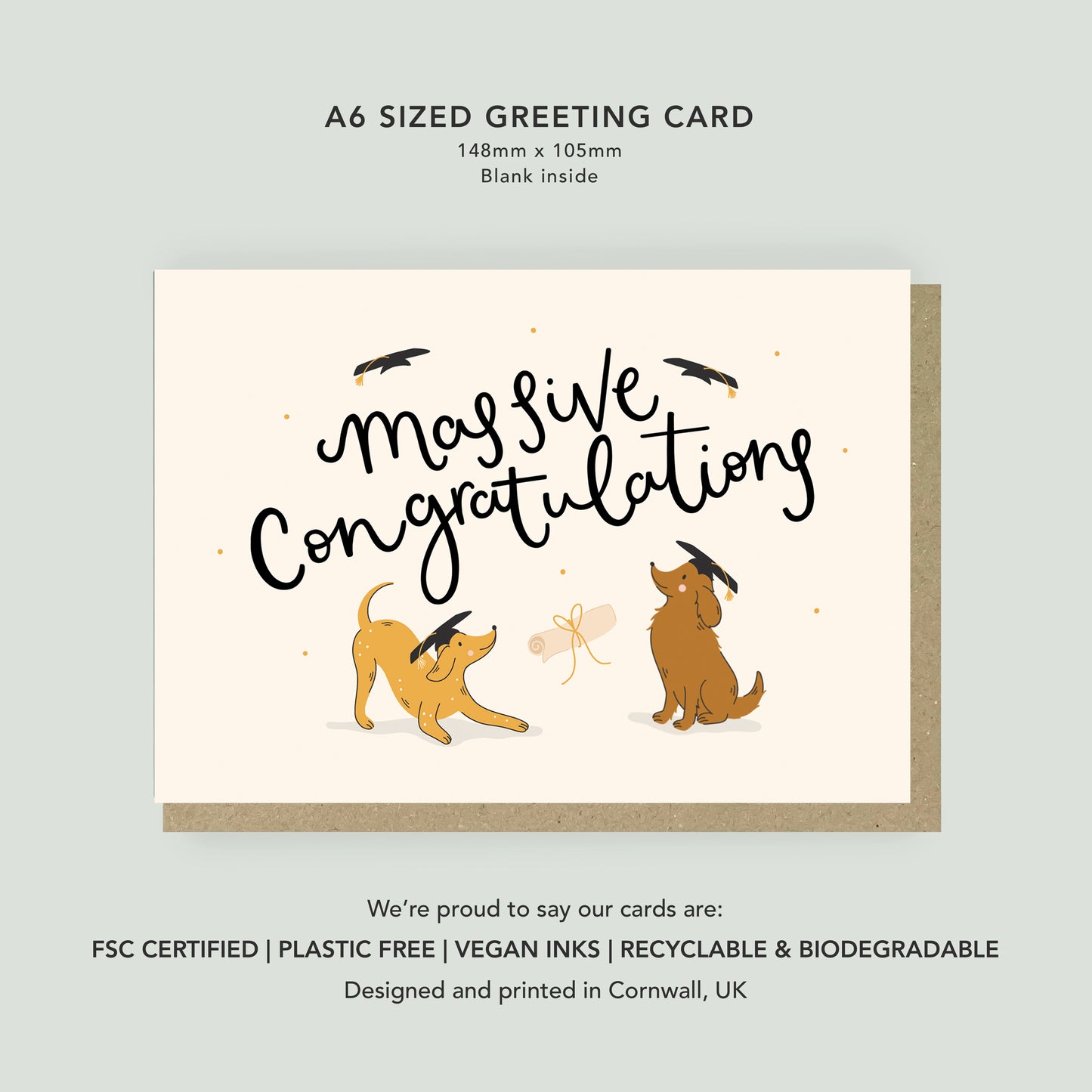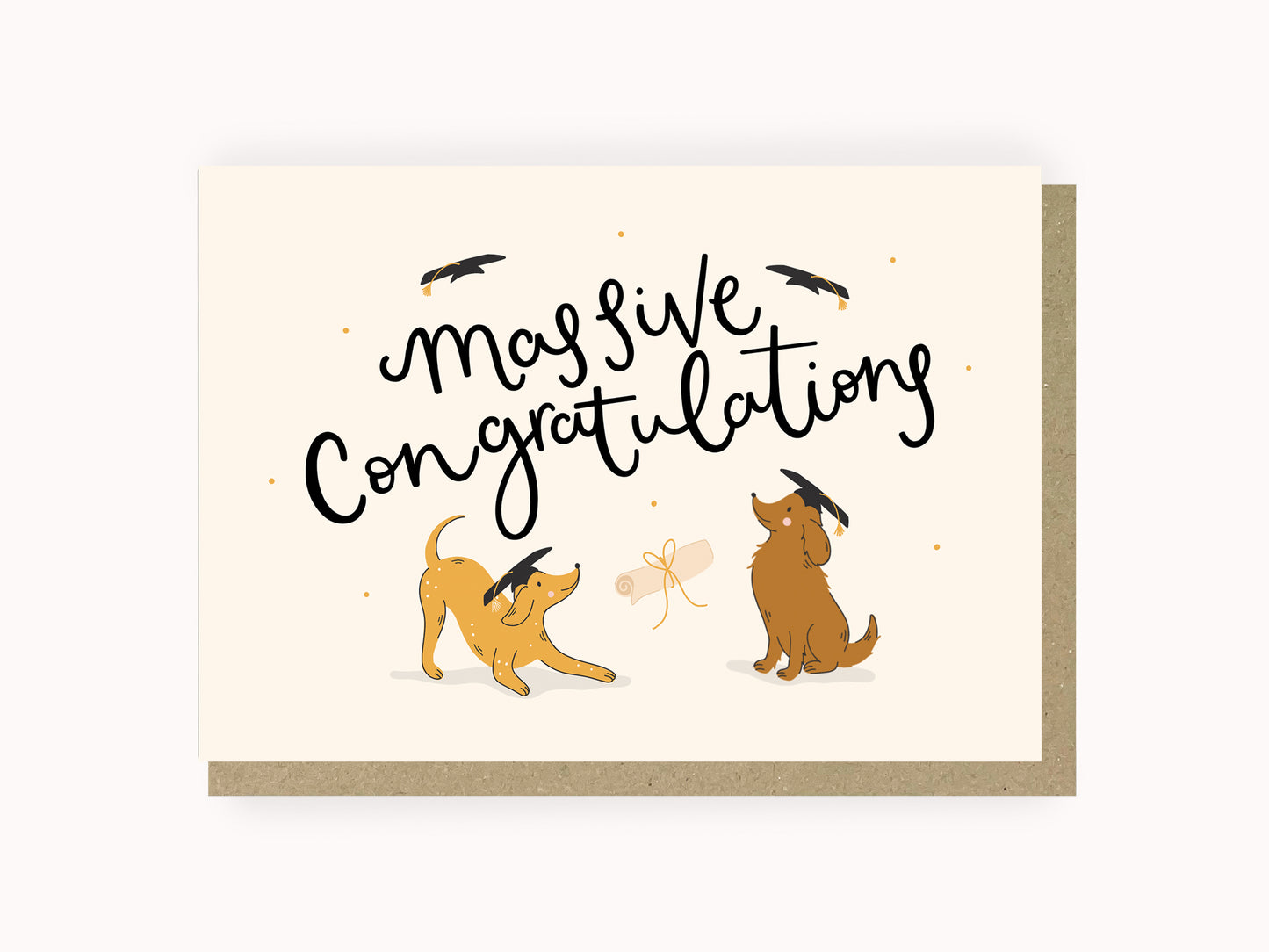 Celebrate your favourite graduate with our 'Massive Congratulations' graduation card! Featuring adorable illustrated dogs in mortarboards, this card is the perfect way to express your pride and joy for their graduation or exam results.