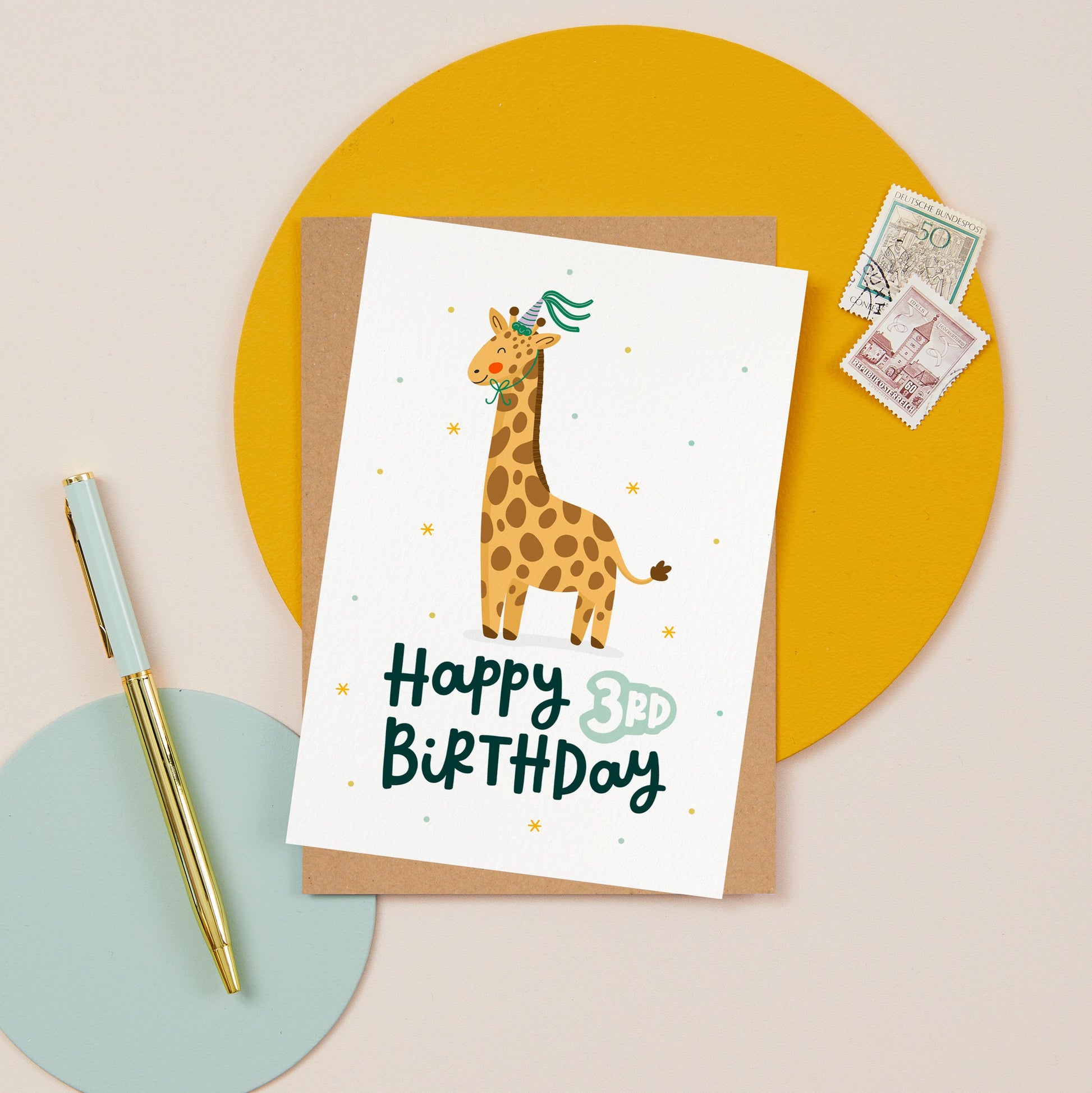 Make your child’s third birthday unforgettable with this charming giraffe-themed card! Featuring a delightful giraffe illustration, it’s the perfect way to celebrate this milestone age for little ones who are enchanted by jungle and safari animals.