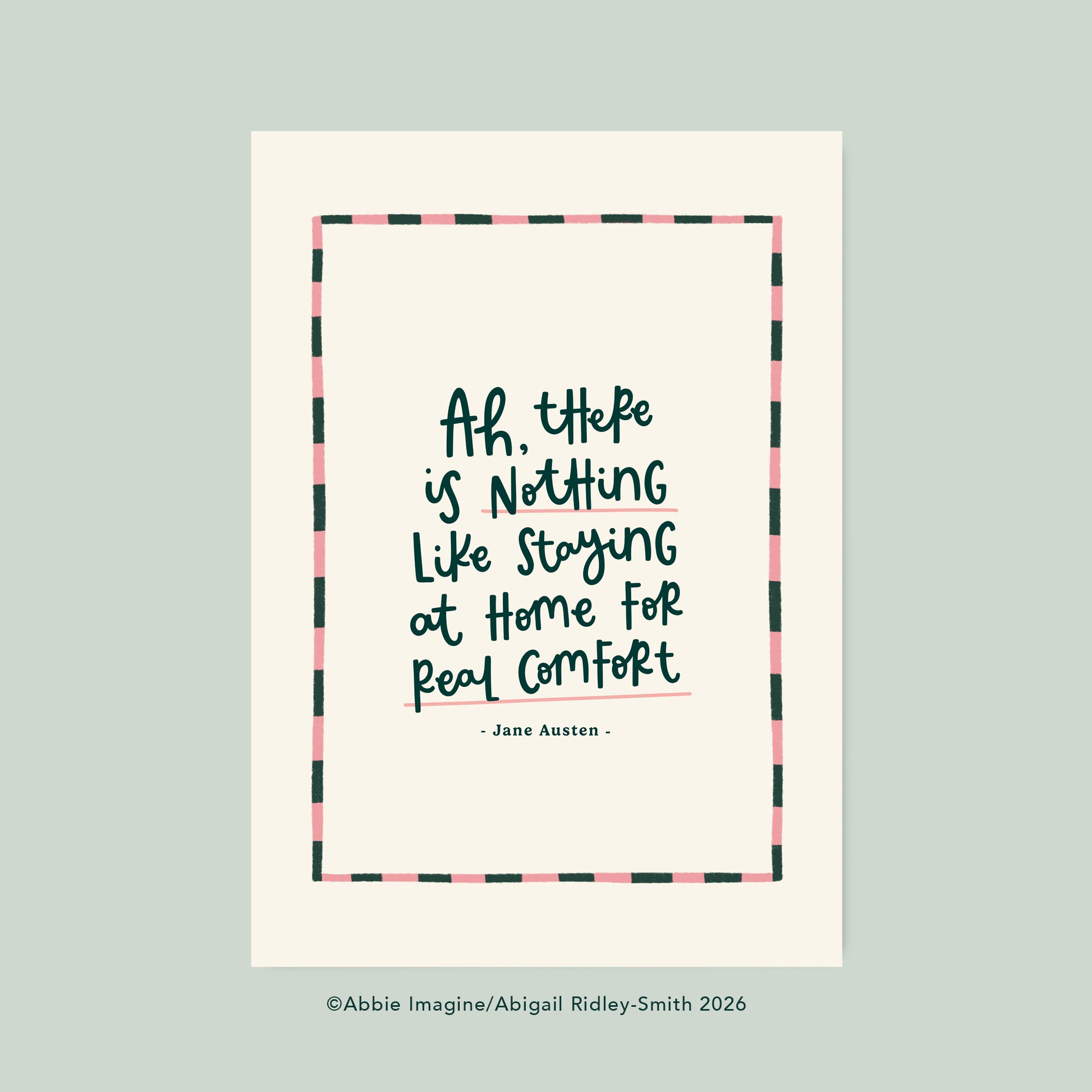 This uniquely hand-lettered Jane Austen quote print reads: Ah, there is nothing like staying at home for great comfort.
